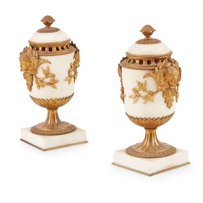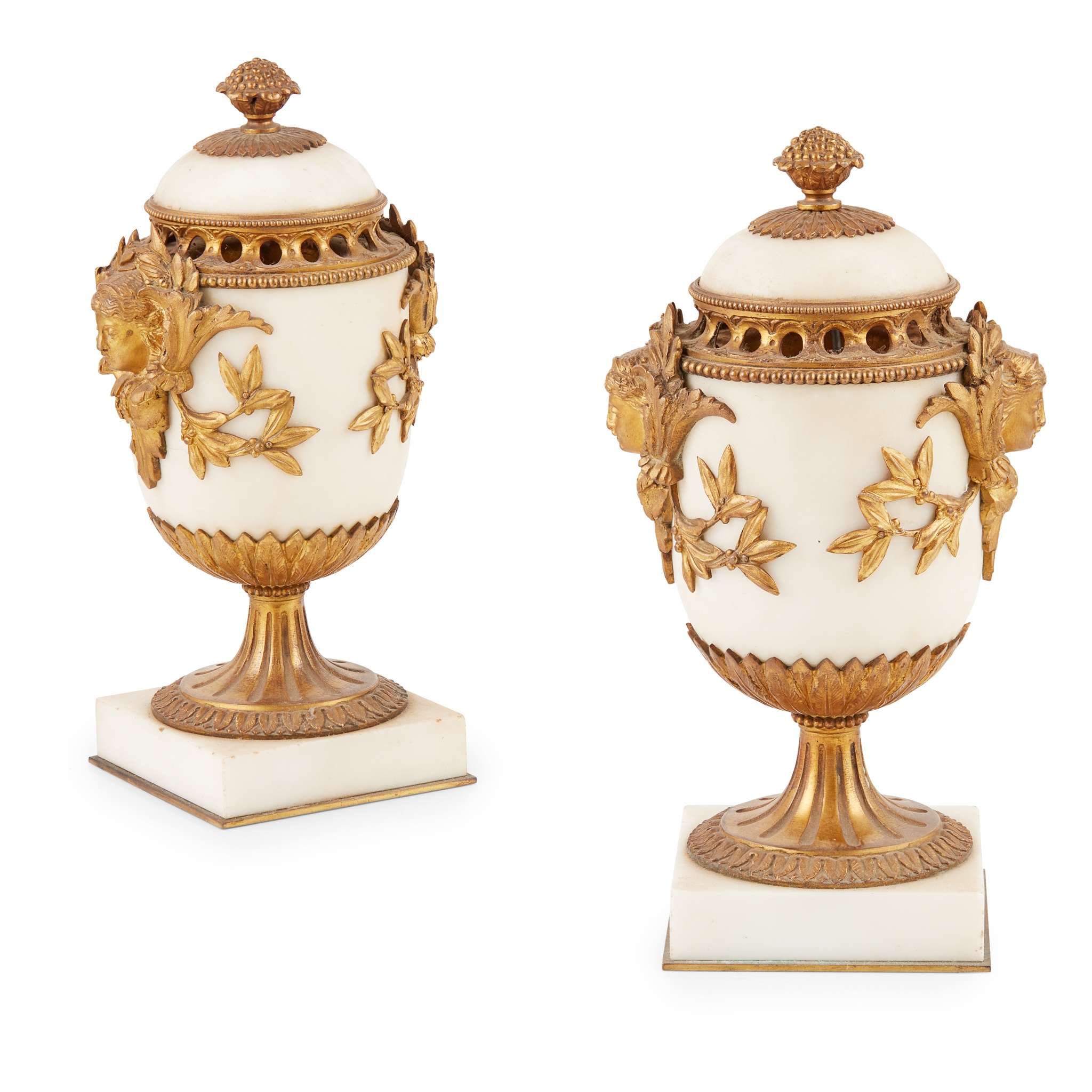 PAIR OF FRENCH WHITE MARBLE AND GILT BRONZE BRÛLE PARFUM