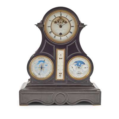 with a two-piece enamel dial with visible Brocot escapement, inscribed REGULATOR GOING ONE YEAR/ ACHILLE BROCOT, above a thermometer and subisidiary barometer and calendar dials with moon phase, the movement stamped 3370
