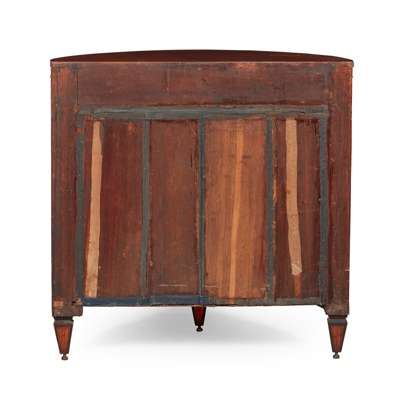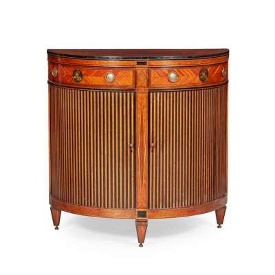 DUTCH NEOCLASSICAL MAHOGANY, EBONISED, FRUITWOOD, AND INLAID DEMI-LUNE SIDE CABINET