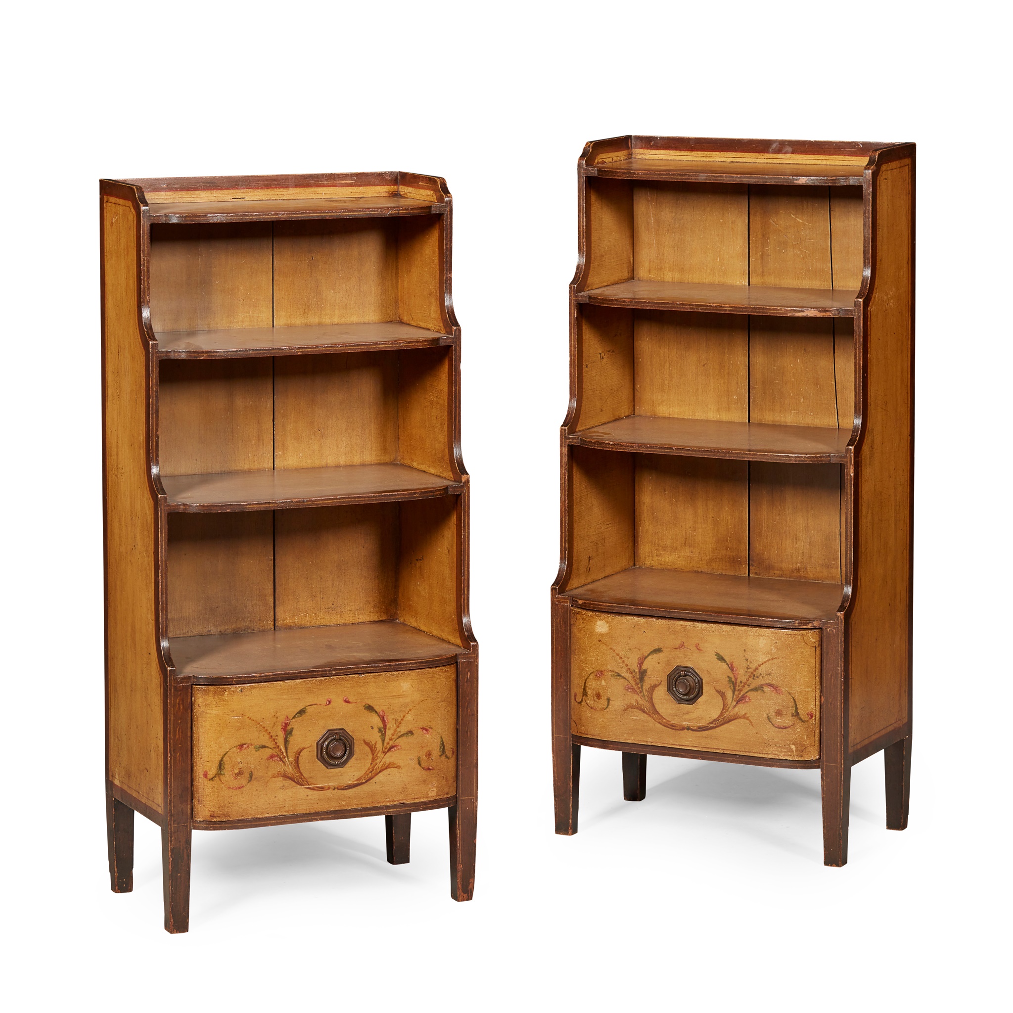 each with three graduated tiers above a base drawer, raised on square tapered legs, painted in ochre outlined with brown, the drawers painted with leafy scrolls