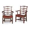 with pierced ladder backs above curved leather upholstered seats flanked by scrolled open arms, raised on channel moulded square legs joined by stretchers