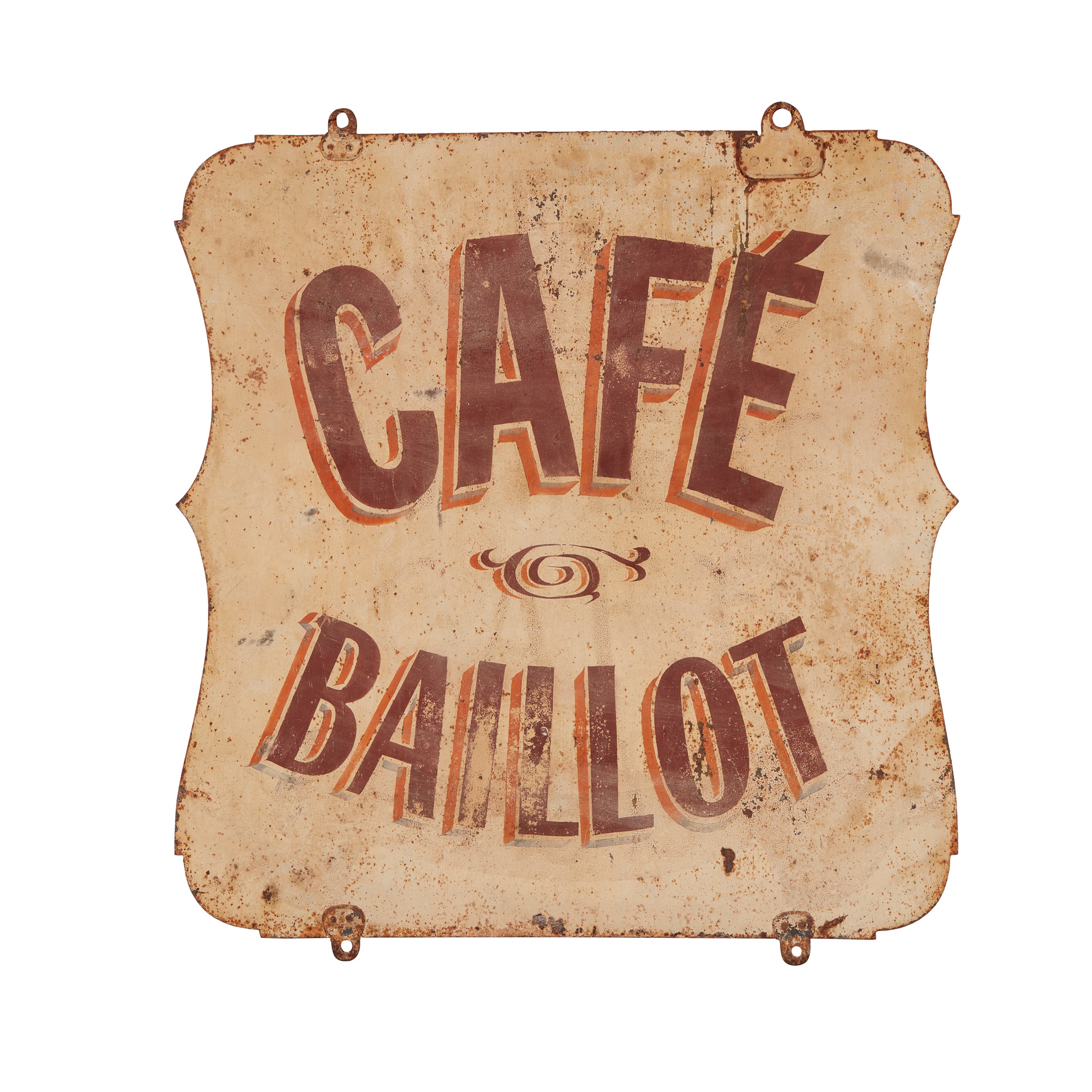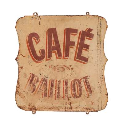 of cartouche shape, painted to both sides, 'CAFE BAILLOT' in red letters on a cream ground