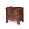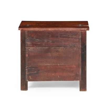 reduced in size, the hinged top over a chip carved front panel with stylised flower motifs and a large iron lock plate, on stile legs