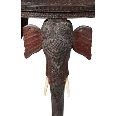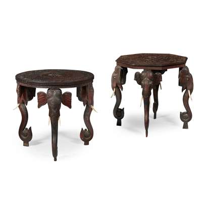 one with a circular top and three elephant head legs with ivory tusks, the other octagonal with similar four legs, carved in relief with stylised leaf motifs and central figural reserves