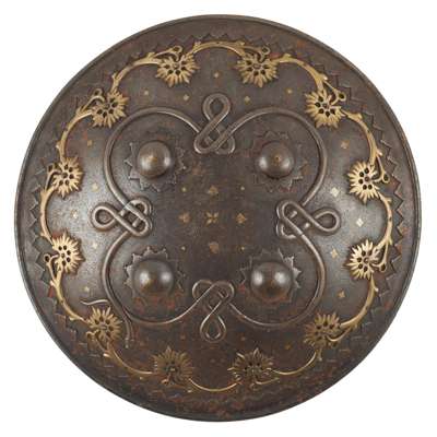 INDIAN GOLD KOFTGARI STEEL SHIELD (DHAL)