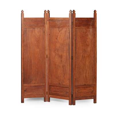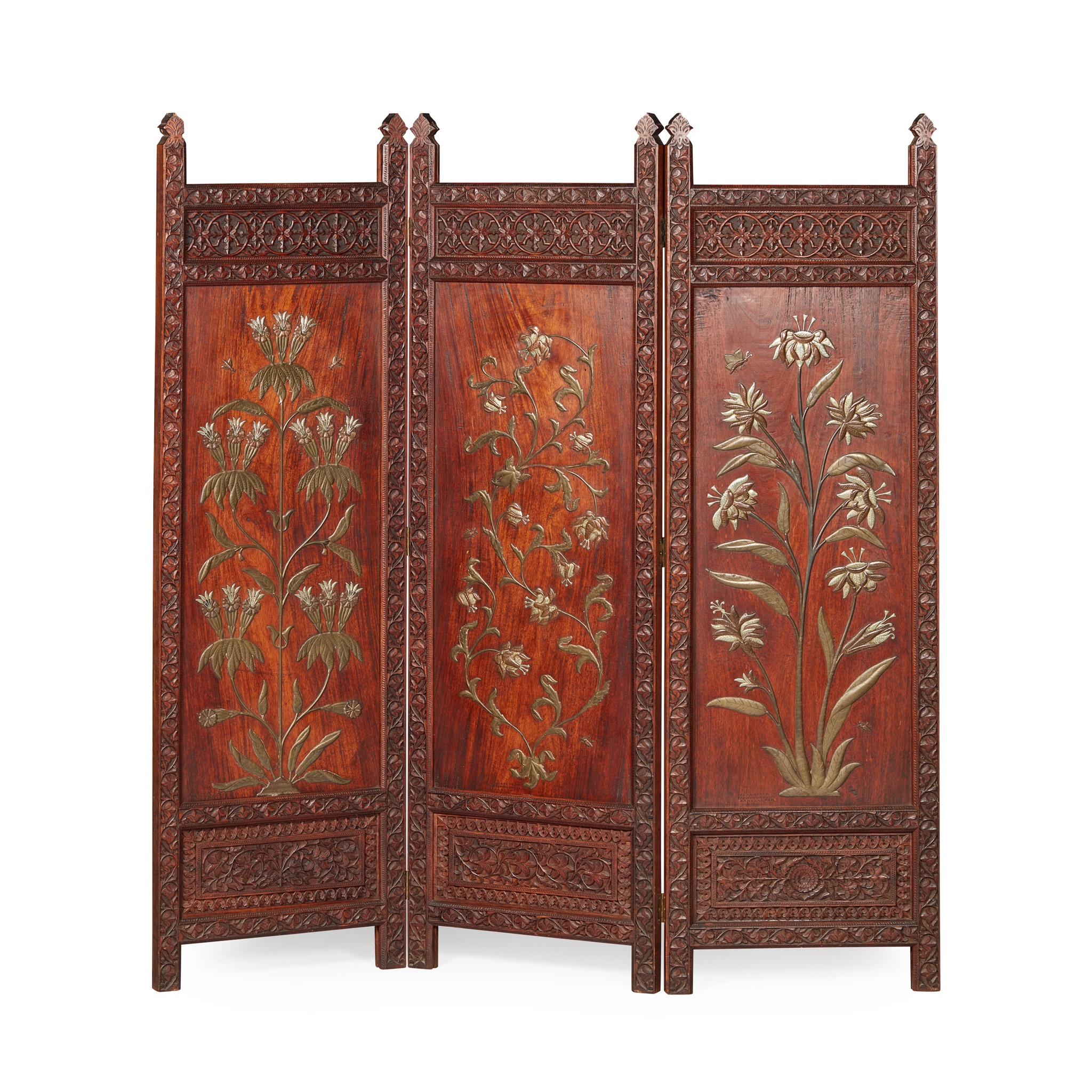 INDIAN PADOUK AND METAL INLAID THREE PANEL SCREEN
