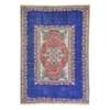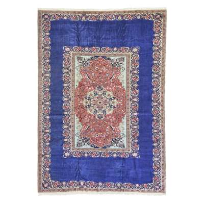 the pink field with light green medallion, light blue spandrels, within wide plain indigo border