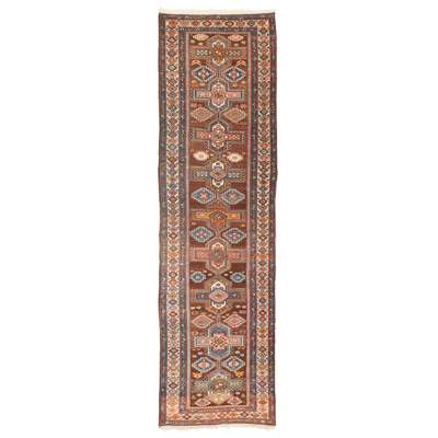 the brown field with nine polychrome cruciform medallions, within ivory border
