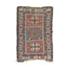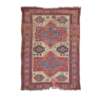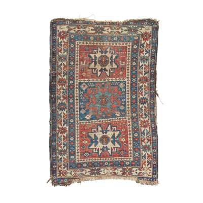 the ivory field with two red geometric medallions, within red border; and a SMALL LESGHI RUG, the red and blue sectioned field with three star medallions, within ivory border