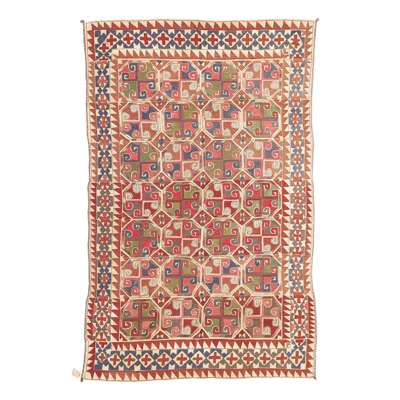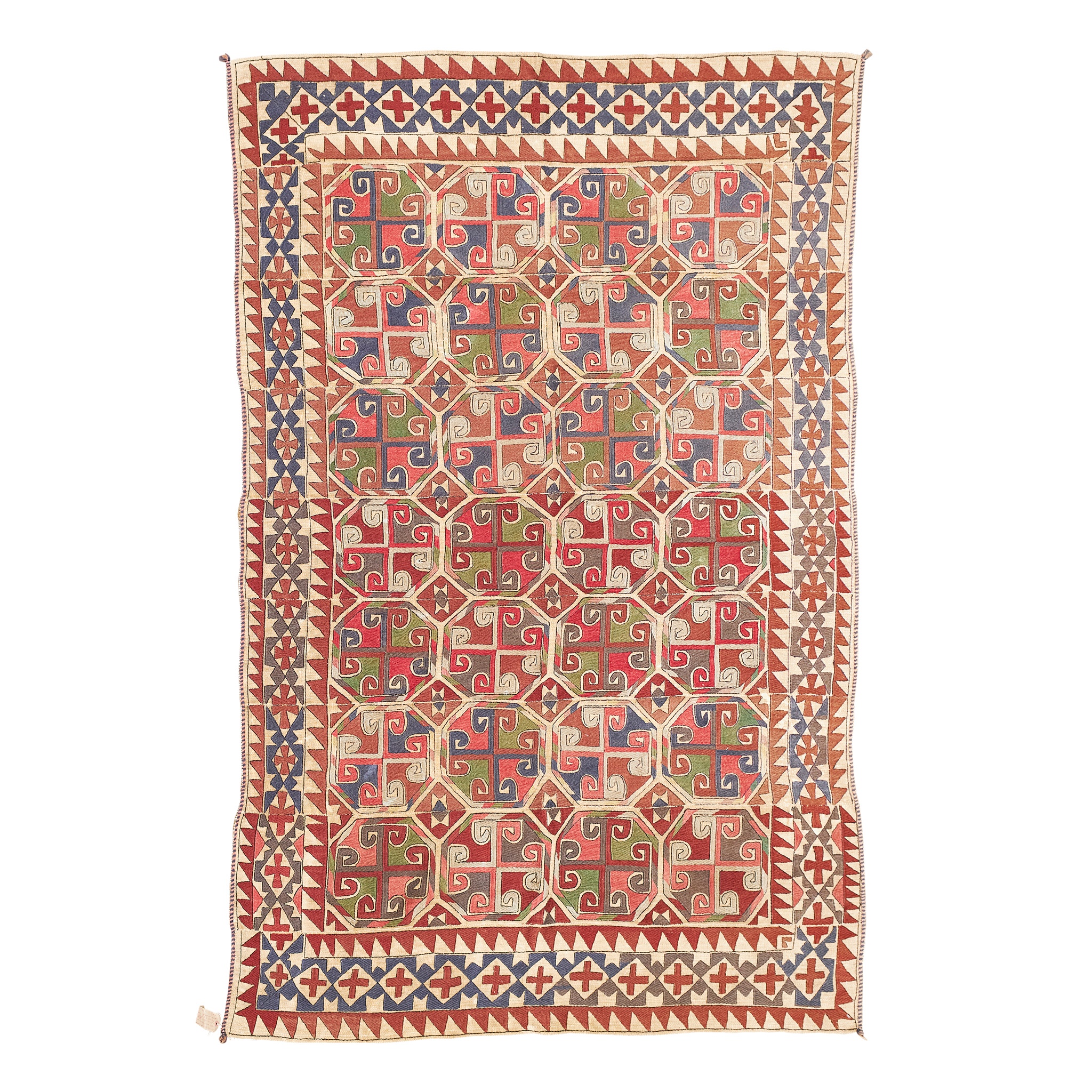 the cream field with allover polychrome medallion pattern, within cream border