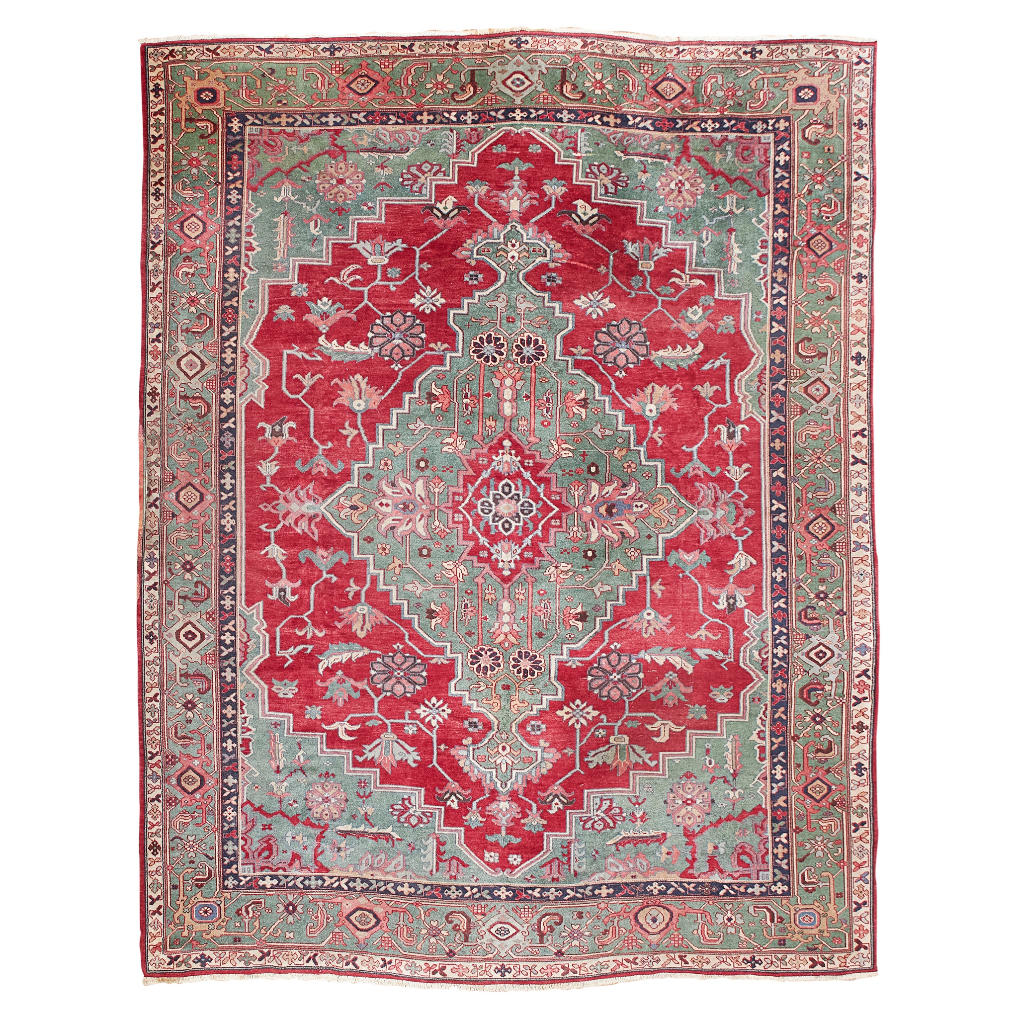 of Heriz design, the red field with large green medallion, similar spandrels, within green border