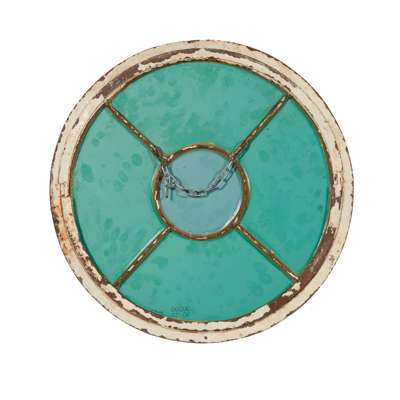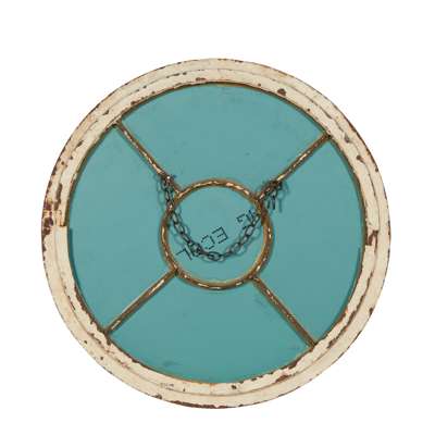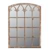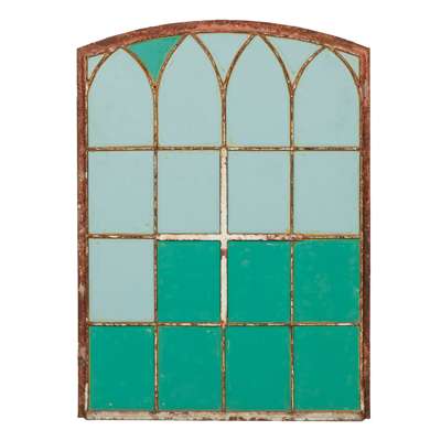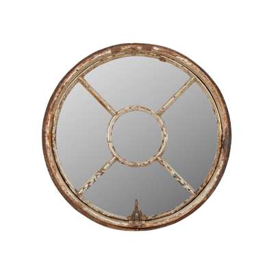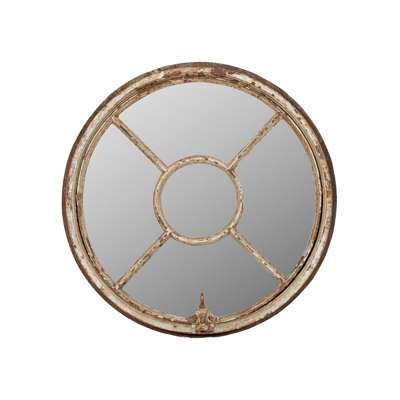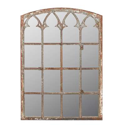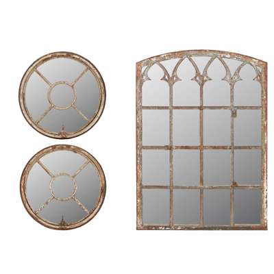 previously window frames, to include a Gothic arched multiple pane panel, and a pair of smaller circular examples, all with modern mirror inserts