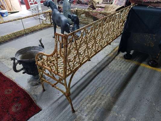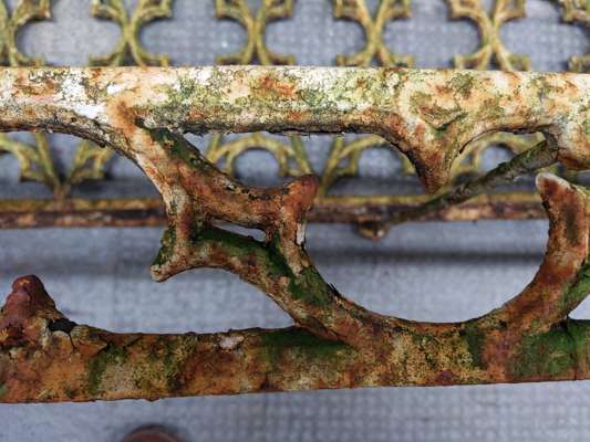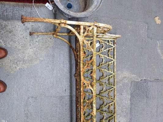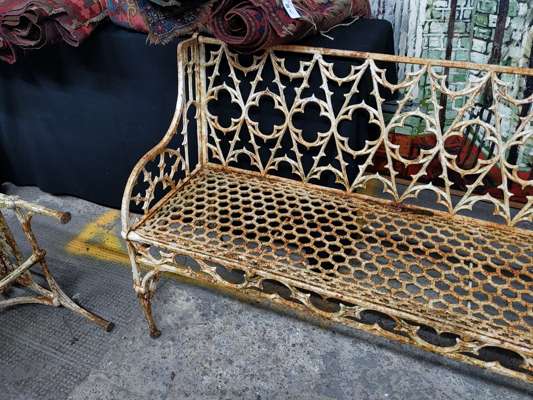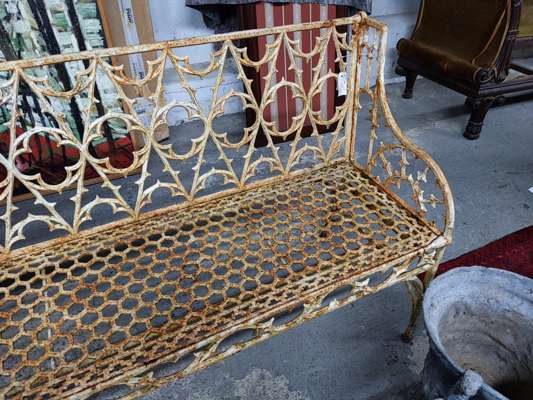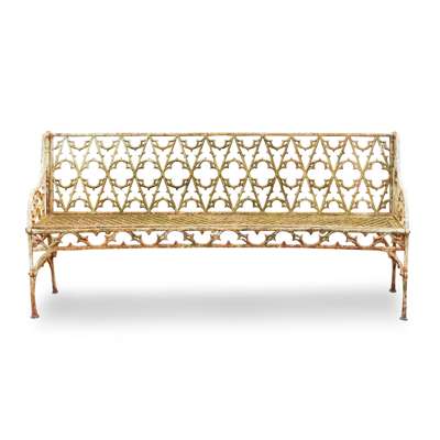 the backs with Gothic tracery above honeycomb pierced seats with pierced tracery apron below