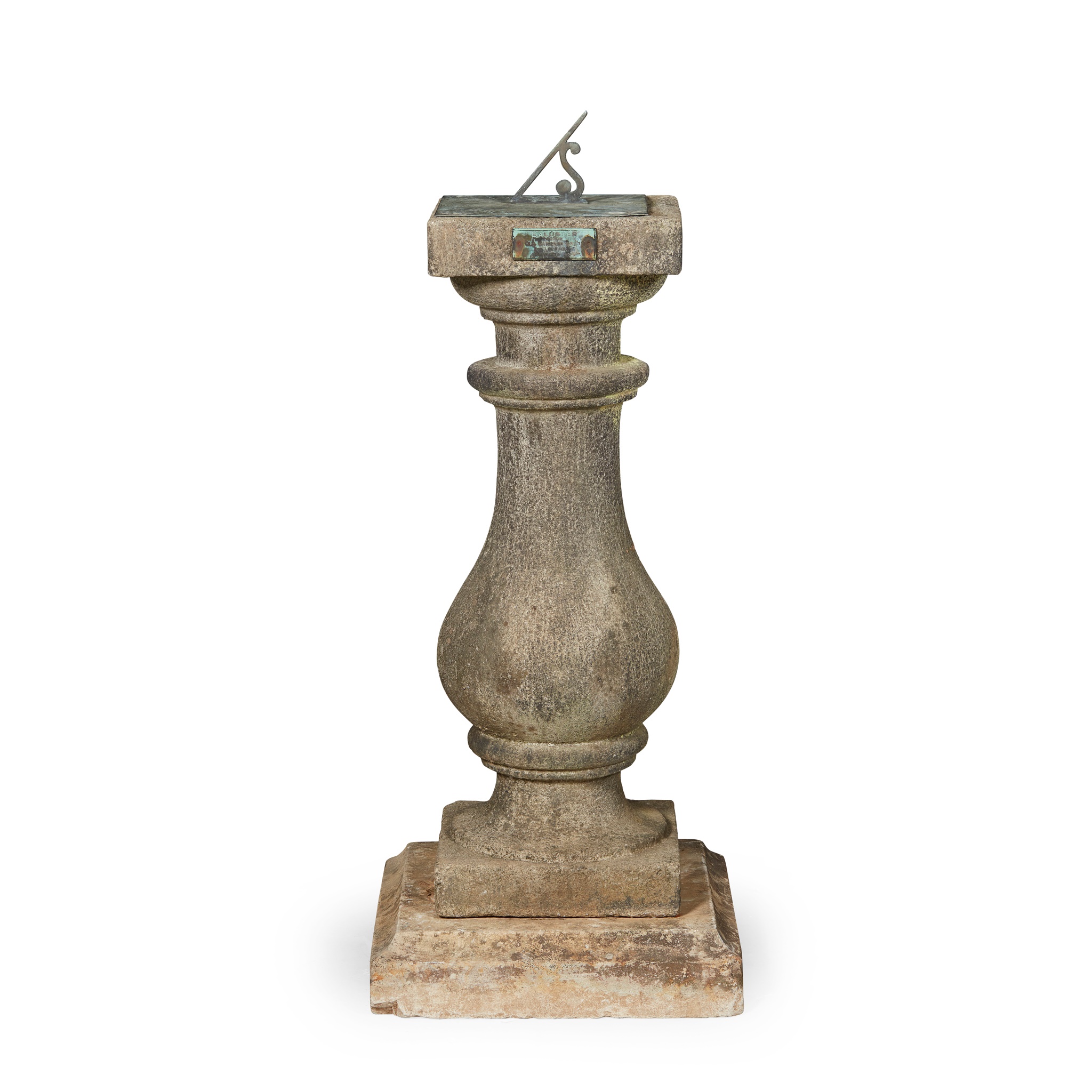 the baluster with a bronze plaque 'BALUSTER FROM OLD WATERLOO BRIDGE LONDON DEMOLISHED 1934'; with a modern bronze sundial