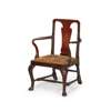 with a vase shaped splat above a drop-in seat flanked by scrolled arms, raised on shell carved cabriole legs ending in pad feet and joined by H stretchers
