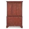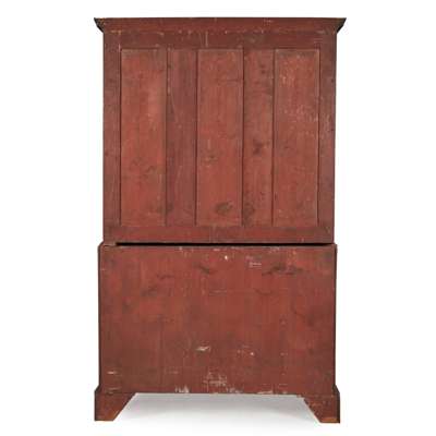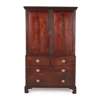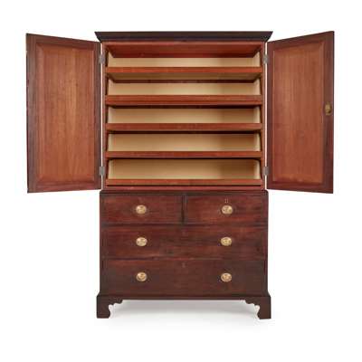 the dentil moulded cornice above a pair of panel doors opening to sliding trays; the base with two short over two long drawers, raised on shaped bracket feet