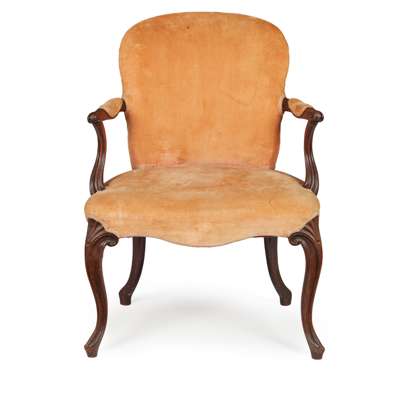 in the Hepplewhite style, the shaped padded back above part padded arms and a wide serpentine stuff-over seat, raised on shell carved cabriole legs; covered in peach plush upholstery