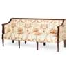 the squared back above a padded seat flanked by enclosed arms with baluster terminal supports, in a reeded frame and raised on tapered reeded legs, covered in a yellow neoclassical print fabric