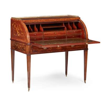LATE GEORGE III MAHOGANY, GONCALO ALVES, MARQUETRY AND PENWORK CYLINDER BUREAU