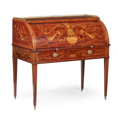 the top with a pierced brass gallery above a cylinder front opening to an interior with pigeon holes, drawers, and a brown leather slide, above a long frieze drawer, raised on square tapered legs ending in brass caps and castors; the whole with scrolling foliate, flowering cornucopia, and harebell trails inlay