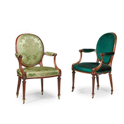 in the Hepplewhite taste, the oval medallion backs above wide seats flanked by part-padded arms on husk carved supports, raised on square tapered fluted legs ending in brass caps and castors; one in green damask, the other dark green plush upholstery