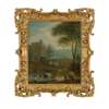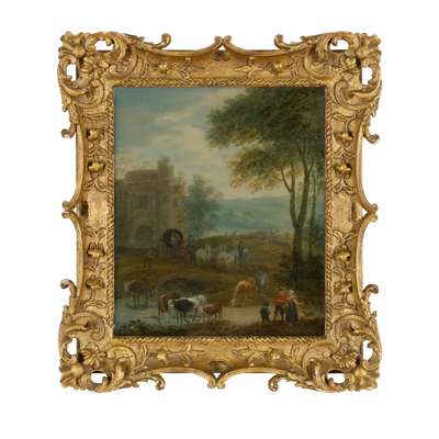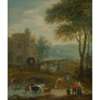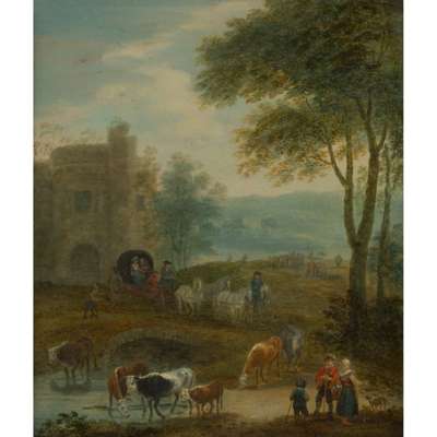 A WOODED RIVER LANDSCAPE WITH TRAVELLERS AND ANIMALS