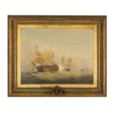 Indistinctly signed and dated 1870, oil on board in a gilt frame with naval emblems