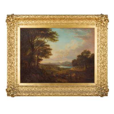 FIGURES ON A WOODED PATH, STIRLING CASTLE IN THE DISTANCE