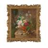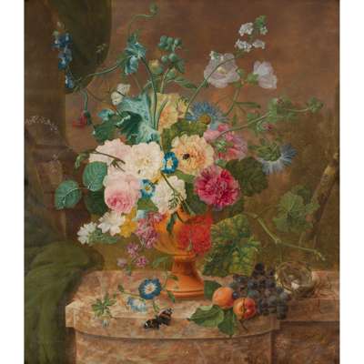 MIXED FLOWERS IN AN URN ON A MARBLE LEDGE
