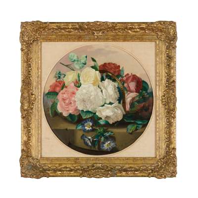 STILL LIFE OF ASSORTED ROSES ON A LEDGE