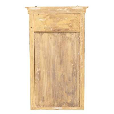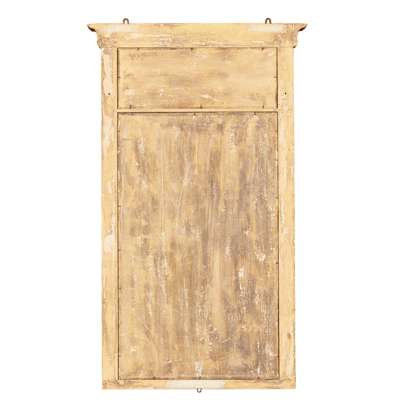 the inverted breakfront cornices with leaf and bead mouldings above eglomisé landscape panels, over rectangular bevelled mirror plates flanked by triple cluster columns