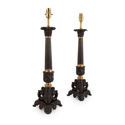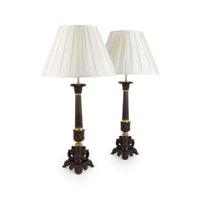PAIR OF LARGE REGENCY PATINATED AND GILT BRONZE CANDLESTICK LAMPS