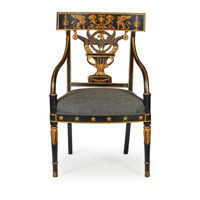 REGENCY EBONISED AND PARCEL GILT DECORATED ARMCHAIR