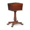 of sarcophagus form outlined with bead moulding, the interior with four tea caddies and reserves for two mixing bowls, on a tapered lotus carved column support and quadripartite base with carved paw feet with brass castors