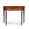 the D shaped fold-over top with crossbanding, on ring turned and reeded tapered legs, the top opening on double gate legs