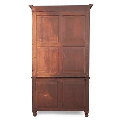 the moulded cornice above a pair of astragal glazed doors, enclosing shelves with green and gilt leather dust guards and lined with pleated yellow fabric; the base with a pair of crossbanded moulded doors enclosing further shelves, raised on turned feet