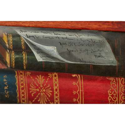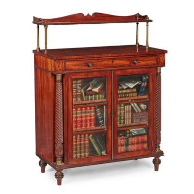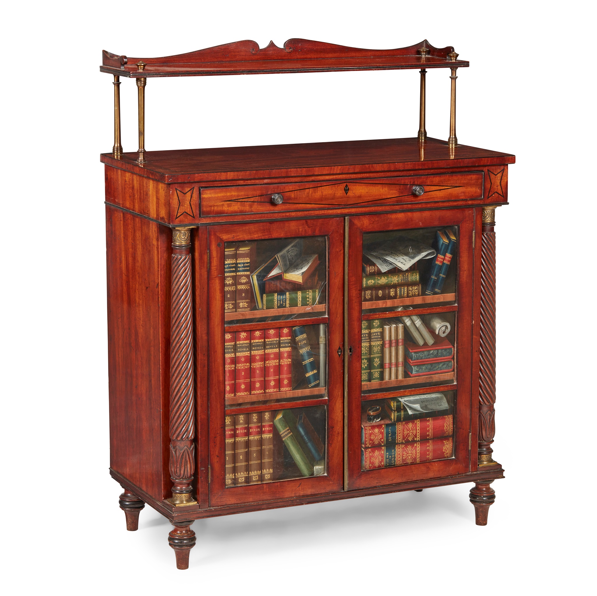 the shelved superstructure on brass columns, above a long frieze drawer with ebony stringing and a pair of glazed doors with eglomisé panels depicting shelves of books, flanked by spiral turned columns carved with lotus and surmounted with brass capitals, on ring turned feet; the painting signed 'James Maggs - Painter/ Bath/ July 1832'