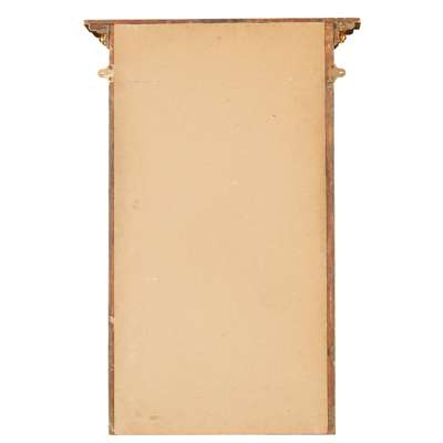 the moulded inverted breakfront cornice with ball mounts, above a gesso moulded frieze depicting Ceres accompanied by putti above a rectangular mirror plate flanked by spiral and leaf-clasped columns