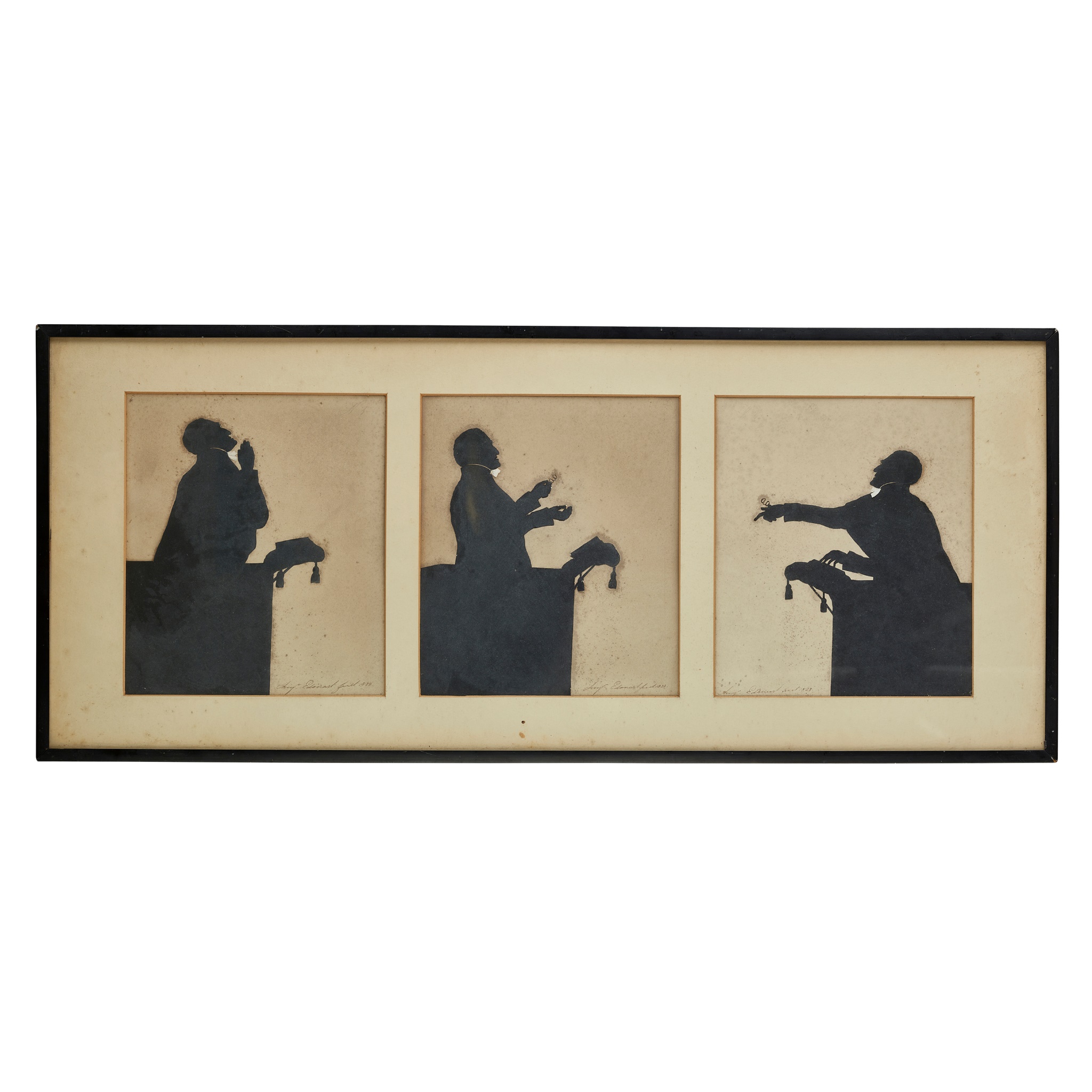 in black card laid on buff paper, the preaching bands applied in white paper, all signed in ink along the bottom margin 'Aug.st Edouart fecit 1828', mounted in a triptych frame