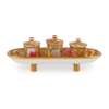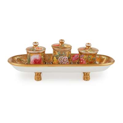 the oval tray on paw feet, with three covered pots, painted with pattern 711, with polychrome flowers on a gilt ground, painted marks SPODE 711