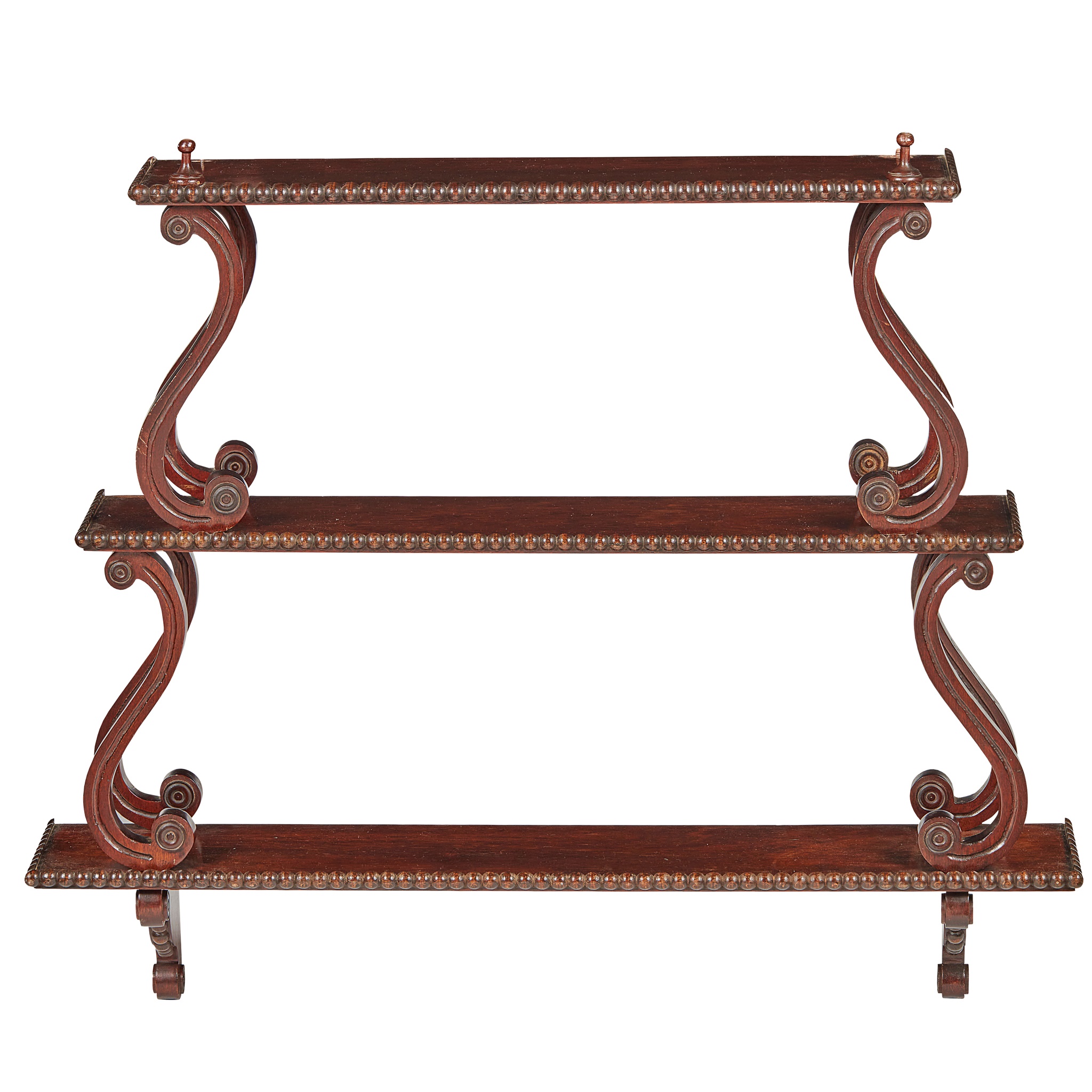 with two graduated shelves with bead moulding, raised on S scroll supports