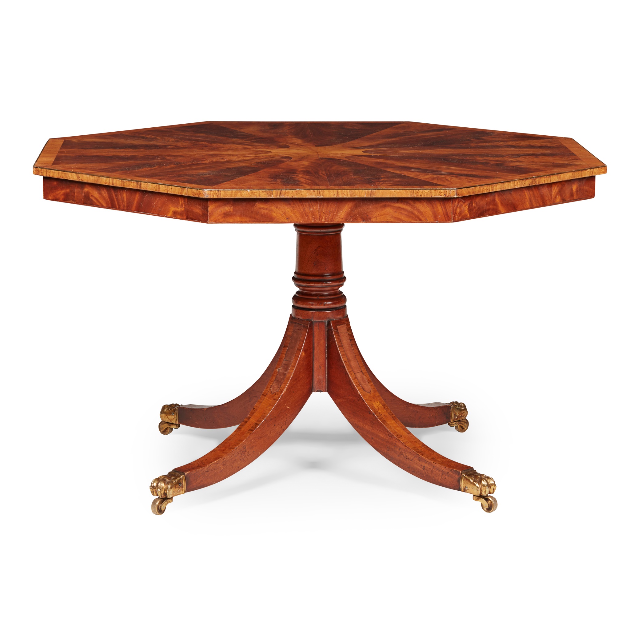 the crossbanded top with sectional veneers on a ring-turned and tapered column and four outswept legs ending in brass paw feet