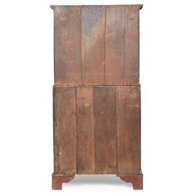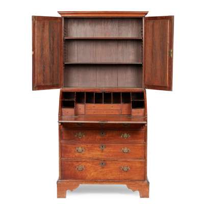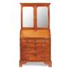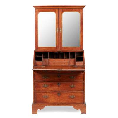 of neat size, the moulded straight cornice above a pair of mirrored doors with bevelled plates and gilt slips, opening to adjustable shelves; the lower part with a slope front enclosing an interior with pigeon holes and drawers, over four long graduated drawers raised on shaped bracket feet