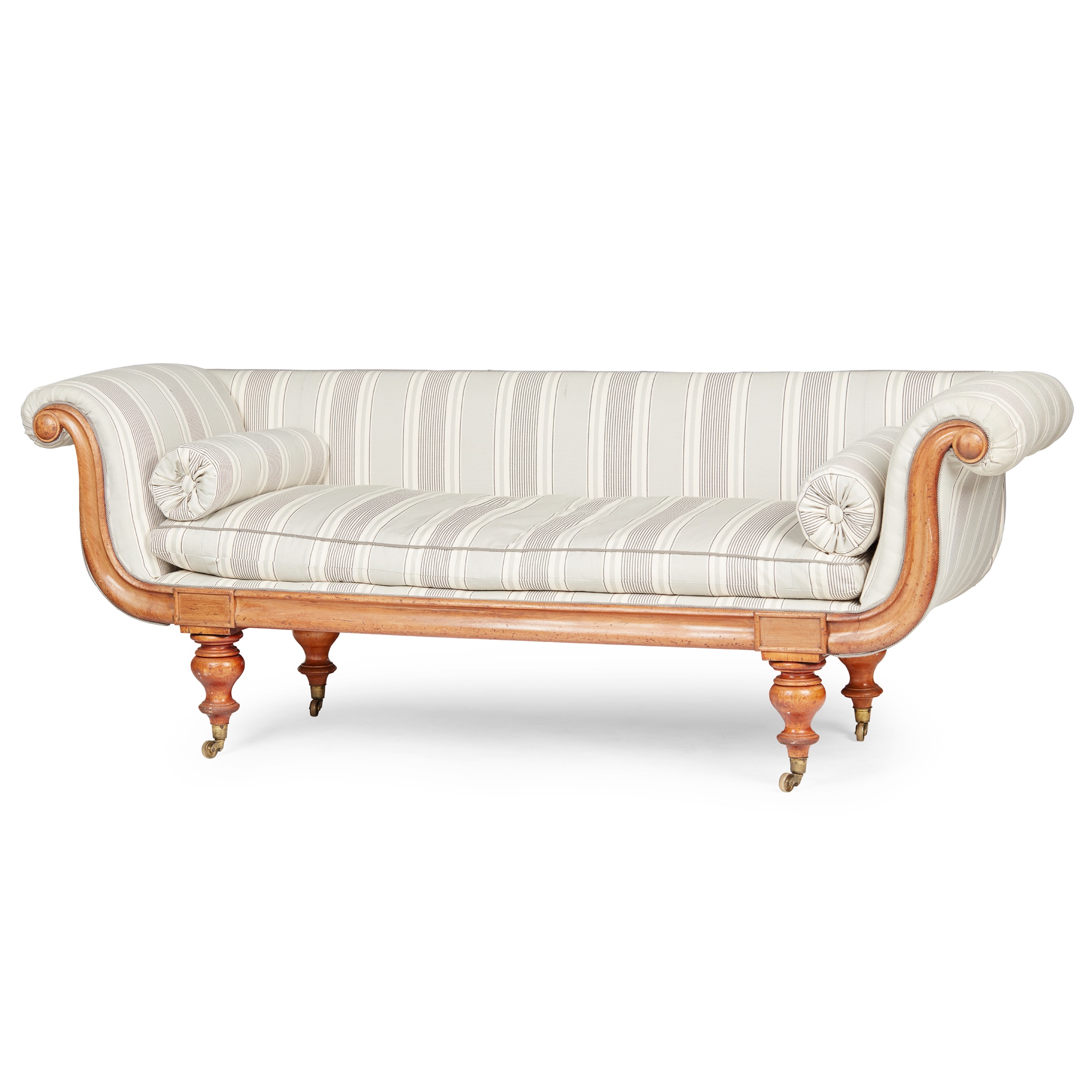 the low back and high scrolled arms over a loose cushion seat with bolsters, raised on bulbous turned legs with brass caps and castors, in blue stripe upholstery