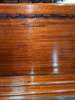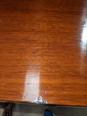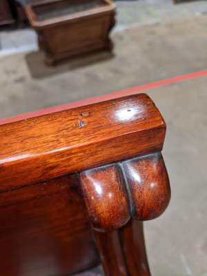 with panel backs with bead and reel moulding above inverted breakfront tops, raised on ring turned tapered columns joined by conforming undertiers and raised on carved paw feet