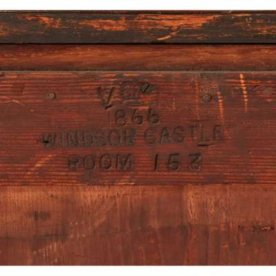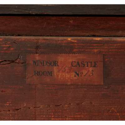 with a brass lined frieze above a pair of glazed doors opening to adjustable shelves, flanked by brass and tapered rosewood columns, raised on lobed feet, stamped on reverse with a crown and '866/ WINDSOR CASTLE/ ROOM 153' with paper label 'WINDSOR CASTLE/ ROOM 153 No. 13'