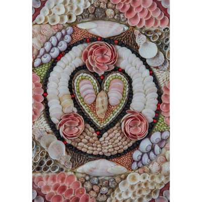 of large form; composed from a variety of shells in concentric and geometric patterns, centred with a heart motif, surrounded by three flowers; within a stained wood frame