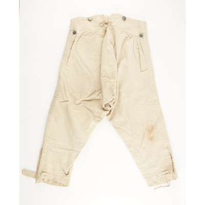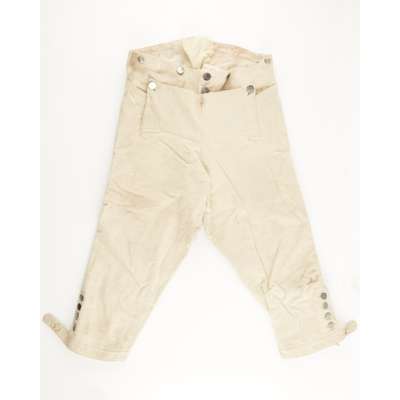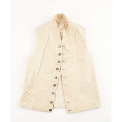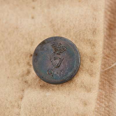 with bullion shoulder epaulettes, black facings with hook and eye front fasteners with silver buttons pressed with GR in the centre and Queens County Regiment, the two tails with concealed pockets and terminating in a decorative silver wire knot, with an internal label inscribed 'Woodbrook'; together with a waistcoat and breeches in cream flannel, with buttons engraved with the initials QC [Queens County] surmounted by the Crowned Harp of Ireland; the breeches with a further label inscribed 'Woodbrook', associated with the coatee