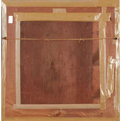 of square form, worked in silks and wools on a linen ground, with a verse above a large building with birds, deer and sheep, flanked by boucle trees, with floral and fruit motifs in satin stitch, all within a strawberry border, in an oak frame