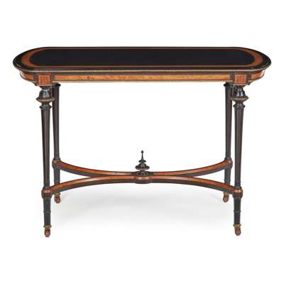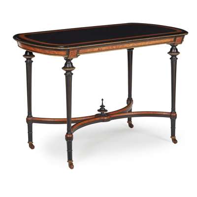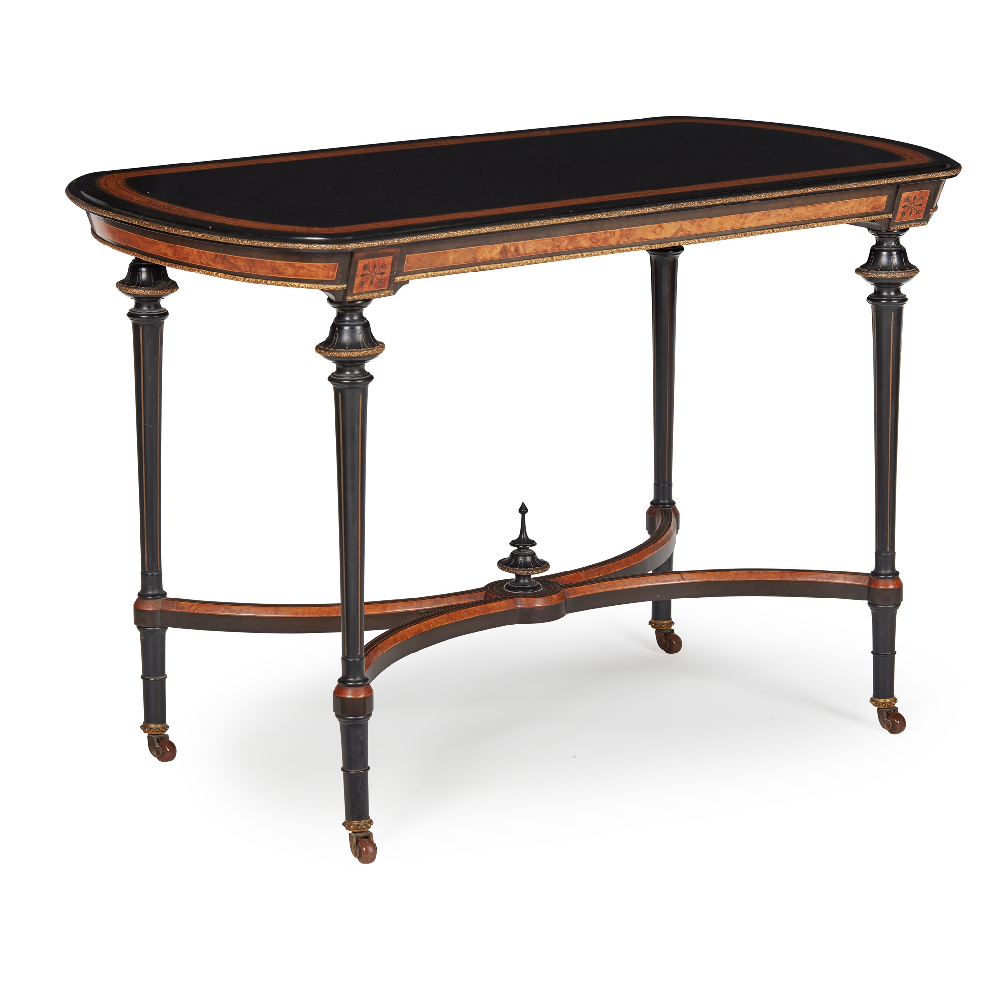 VICTORIAN EBONISED, AMBOYNA, AND BRASS MOUNTED CENTRE TABLE